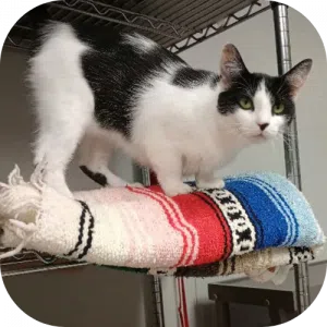 Sam is a striking black and white one-year-old cat whose markings are as balanced as her personality. She’s affectionate, curious, and independent with just the right amount of snuggle. You can always find Sam by the door in the cat room here ready to greet you so whether you’re looking for a quiet companion or a gentle friend to share your space, Sam is ready to bring balance and love into your life. She’s litter trained up to date on vaccinations and patiently waiting for the right person to share her love with.