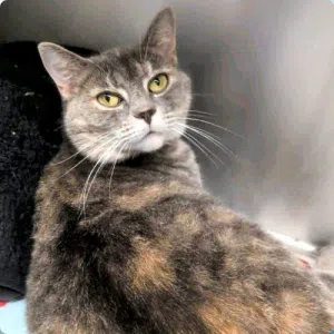 Esther isn’t just another beautiful calico cat—she’s a staff and volunteer favorite for a reason: she’s warm, outgoing, and absolutely knows she deserves to be #1 in your heart (and your home).