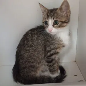 Sweet Pea is a petite 6-month-old kitten who is as gentle and loving as her name suggests. She’s a stunning white and tabby cat with the softest fur.