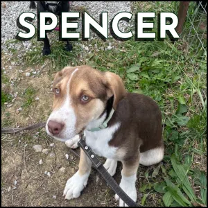 He’s learning the ropes of puppy life and he’s eager to please. Spencer loves toys, belly rubs, and exploring the world. He’s great with other dogs and would thrive in a home that can offer him structure, love, and lots of playtime.