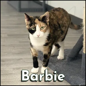 Barbie is a stunning calico cat with a coat as colorful as her personality. She’ll immediately capture your attention with her stunning green eyes.