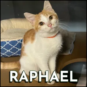 I’d also like to introduce you to Raphael, a stunning orange and white 5 month old kitten. This guy is a pure lover and wants to be your best friend. Expect Raphael to be your shadow, your companion and your lap cat. He loves an adventure, but his favorite thing to do is cuddle.