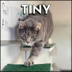 Tiny’s name might be a little misleading — he’s a solid 16 pounds of gray, fluffy, gorgeous cat. At three years old, he’s calm, confident, and absolutely majestic. If you’ve been dreaming of a big cuddle buddy to rule your living room kingdom, Tiny is your guy!